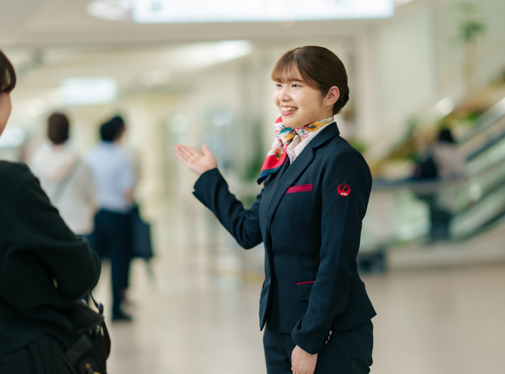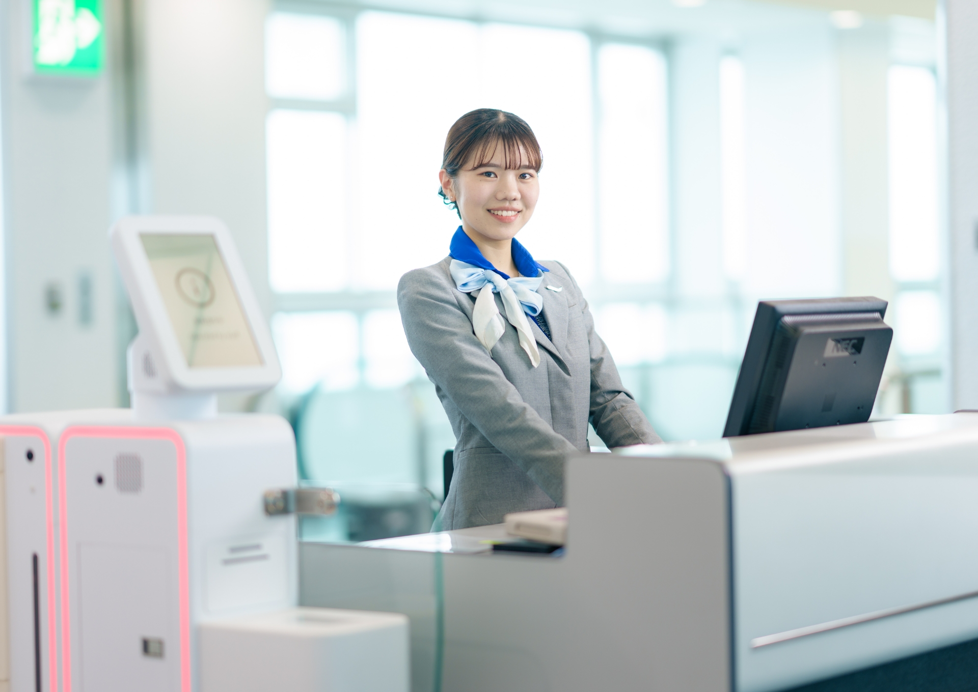 私が仕事で大切にしているのは「挨拶」です。忙しい時も必ずお客さまの目を見て「お待たせいたしました」「ありがとうございます」と頭を下げるよう心がけています。挨拶はお客さまとのコミュニケーションのきっかけとなり、職場でも良い雰囲気づくりに欠かせません。この挨拶を大切にする意識は日々の業務でも活かすことができます。搭乗ゲート業務では、お客さまが全員搭乗されるまで気が抜けません。出発ロビーを巡回し、乗り遅れることがないよう、お声がけを行います。